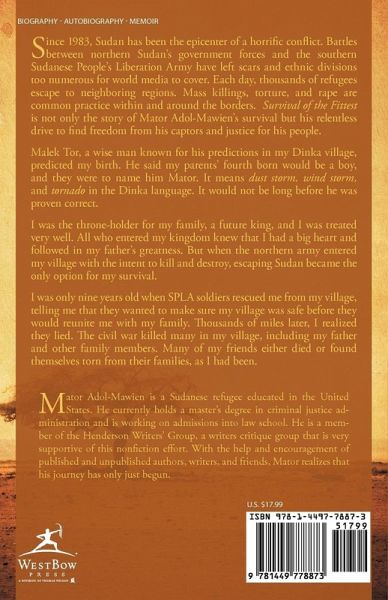 Since 1983, Sudan has been the epicenter of a horrific conflict. Battles between northern Sudan's government forces and the southern Sudanese People's Liberation Army have left scars and ethnic divisions too numerous for world media to cover. Each day, thousands of refugees escape to neighboring regions. Mass killings, torture, and rape are common practice within and around the borders. Survival of the Fittest is not only the story of Mator Adol-Mawien's survival but his relentless drive to find freedom from his captors and justice for his people. Malek Tor, a wise man known for his predictions in my Dinka village, predicted my birth. He said my parents' fourth born would be a boy, and they were to name him Mator. It means dust storm, wind storm, and tornado in the Dinka language. It would not be long before he was proven correct. I was the throne-holder for my family, a future king, and I was treated very well. All who entered my kingdom knew that I had a big heart and followed in my father's greatness. But when the northern army entered my village with the intent to kill and destroy, escaping Sudan became the only option for my survival. I was only nine years old when SPLA soldiers rescued me from my village, telling me that they wanted to make sure my village was safe before they would reunite me with my family. Thousands of miles later, I realized they lied. The civil war killed many in my village, including my father and other family members. Many of my friends either died or found themselves torn from their families, as I had been.