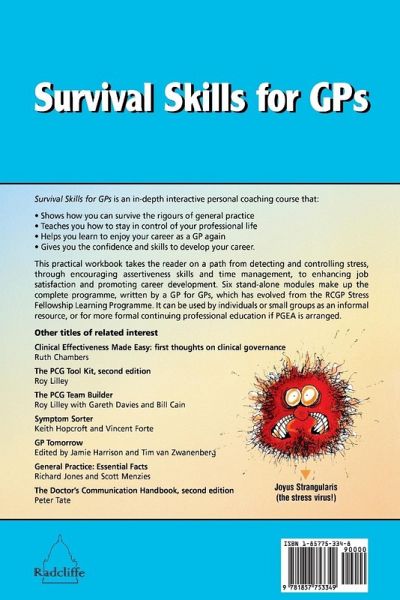 Survival Skills for GPs is an in-depth interactive personal coaching course that: * Shows how you can survive the rigours of general practice * Teaches you how to stay in control of your professional life * Helps you learn to enjoy your career as a GP again * Gives you the confidence and skills to develop your career The first personal coaching course for GPs presented as an interactive workbook, which allows individual GPs, to progress from any stress in their lives through to job satisfaction and career development. It is applicable to all areas of life and shows comparisons to how other GPs' are doing. Survival is not only about learning to cope with the changing circumstances of being a GP, but how to flourish and enjoy work and life in general. This practical workbook takes the reader on a path from becoming more aware of the causes of stress, the effects and reactions to stress, through to looking at positive solutions and ideas. Survival skills for GPs is a specific programme written by a GP for GPs, which has evolved from the RCGP Stress Fellowship Learning Programme. It comprises six stand alone chapters which introduce stress management in both personal and professional lives. With in-depth practical ideas it can be used by individuals or small groups as an informal resource, or for more formal continuing professional education if PGEA is arranged. Here's what GPs have said about the Survival Skills for GPs programme:'I liked the effective content and approach' 'Made me realise I am not alone and that I can improve' 'Helped me look at the good points of my work' 'Makes you think more than attending a course would' 'Useful to see how much of my stress equalled other GPs''