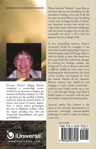 When Erminia "Minnie" Lopez Rincon was born, she was not breathing, but the attendant working on her tiny body did not give up until Rincon was breathing on her own. So began the life of a Mexican American woman who would not only endure many unforeseen challenges and emotional struggles, but would also eventually rise above it all to find her passion and true calling in life. In her compelling memoir, Rincon eloquently details her struggles to rise above her humble beginnings living in a railroad camp outside of Chicago, Illinois, with her family of nine. She shares how she coped with life's unforeseen changes by burying her feelings, reading, and doing well in school. Rincon chronicles a difficult childhood only made more challenging by discrimination, the death of her mother, and betrayal by those she trusted. Despite all her obstacles, Rincon matures into adulthood and manages to lead a fairly normal life-until her past finally catches up to her. It is only through therapy that Rincon finally begins to reconcile with her past and realize a long-held, burning desire. Survival within Two Cultures is the story of one woman's determination to overcome seemingly insurmountable challenges in order to make her dreams come true.