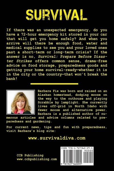 If there was an unexpected emergency, do you have a 72-hour emergency kit stored in your car that will get you home safely? And when you arrive will there be enough food, water and medical supplies to see you and your loved ones past a short-term or long-term crisis? If the answer is no, Survival: Prepare Before Disaster Strikes offers common sense, drama-free advice on food storage, preparedness goods and getting your home survival-ready - whether it is in the city or the country - that won't break the bank! About the Author: Barbara Fix was born and raised on an Alaskan homestead, dodging moose on the way to the outhouse and playing Scrabble by lamplight. She currently lives off-grid in North Idaho with fewer moose and alternative power. Barbara is a published author of numerous articles and advice columns related to preparedness and gardening. For current news, tips and fun with preparedness, visit Barbara's blog site: www.survivaldiva.com