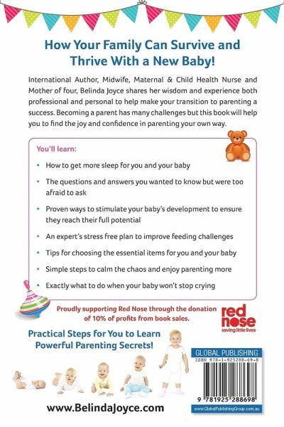 How your family can survive and thrive with a new baby! International author, midwife, maternal & child health nurse and mother of four, Belinda Joyce shares her wisdom and experience both professional and personal to help make your transition to parenting a success. Becoming a parent has many challenges but this book will help you to find the joy and confidence in parenting your own way. You'll learn: How to get more sleep for you and your baby The questions and answers you wanted to know but were too afraid to ask Proven ways to stimulate your baby's development to ensure they reach their full potential An expert's stress-free plan to improve feeding challenges Tips for choosing the essential items for you and your baby Simple steps to calm the chaos and enjoy parenting more Exactly what to do when your baby won't stop crying Practical steps for you to learn powerful parenting secrets! Proudly supporting Red Nose through the donation of 10% of profits from book sales