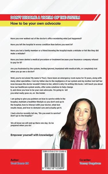 DON'T BECOME A VICTIM OF THE SYSTEM How to be your own advocate Have you ever walked out of the doctor's office wondering what just happened? Have you left the hospital in worse condition than before you went in? Have you lost a family member or a friend knowing the hospital made a mistake or felt like they did make a mistake? Have you been denied a medical procedure or treatment because your insurance company refused to pay for it? Are you frustrated by the system, feeling ignored, inundated with medical bills, or completely lost when you go see a doctor? Well, you're not alone! My name is Traci, I have been an emergency room Nurse for 12 years, along with many other specialties. I lost my father due to the negligence of our system and my mother lost half her nose because the doctor wouldn't listen to her, which is why I'm writing this book. I will teach you about how our health system works, offer some solutions to help change it, and show you how to be your own advocate. I'm going to tell you what really goes on, on the inside! I am going to give you pointers on how to survive while in the hospital, maintain a healthier lifestyle so you don't end up in the hospital, how to interact with your doctor, what test results mean, and how to demand care and actually get it. I had a doctor recently tell me, "Do you want to survive? Don't go to the hospital. We all know we will end up there one day. So be prepared when you do! Empower yourself with knowledge!
