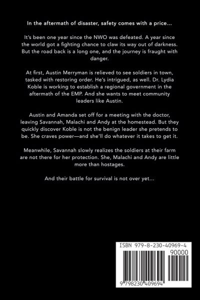 In the aftermath of disaster, safety comes with a price... It's been one year since the NWO was defeated. A year since the world got a fighting chance to claw its way out of darkness. But the road back is a long one, and the journey is fraught with danger. At first, Austin Merryman is relieved to see soldiers in town, tasked with restoring order. He's intrigued, as well. Dr. Lydia Koble is working to establish a regional government in the aftermath of the EMP. And she wants to meet community leaders like Austin. Austin and Amanda set off for a meeting with the doctor, leaving Savannah, Malachi and Andy at the homestead. But they quickly discover Koble is not the benign leader she pretends to be. She craves power-and she'll do whatever it takes to get it. Meanwhile, Savannah slowly realizes the soldiers at their farm are not there for her protection. She, Malachi and Andy are little more than hostages. And their battle for survival is not over yet...