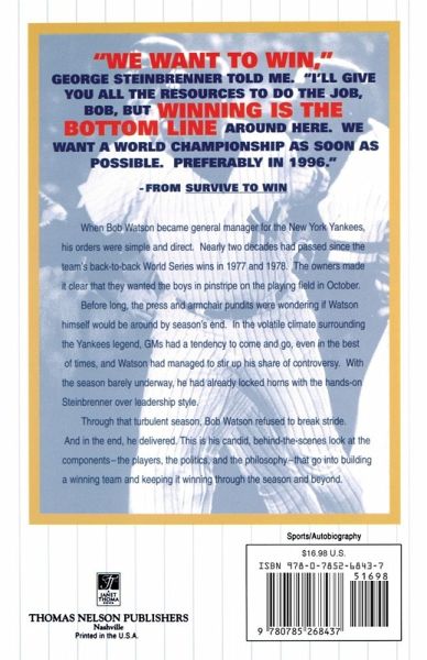 When Bob "Bull" Watson was hired as general manager of the New YorkYankees in 1996, his orders were to give the club a title it had nothad since 1977 and 1978 World Series Champions -- to do it as soon aspossible, preferably that same year.Watson survived that pressure just as he survived his bout with cancerand his difficult climb out of the minor leagues in the raciallyturbulent 1960s. "After 32 years in baseball .. surviving may be theone thing I do best." Interwoven with his life story is an informativeand entertaining discussion of all things baseball -- how a hitterthinks, how to build a powerful ball club, how to manage thepersonalities and egos in the game, and how the game has changed overthe years.