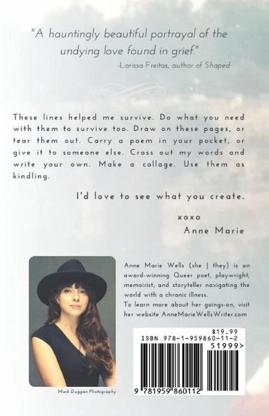 These lines helped me survive. Do what you need with them to survive too. Draw on these pages, or tear them out. Carry a poem in your pocket, or give it to someone else. Cross out my words and write your own. Make a collage. Use them as kindling. I'd love to see what you create. xoxo , Anne Marie This beautiful and heartfelt collection is a vulnerable look into an the consuming grief of losing a loved one - and the the love and healing that comes during and after loss. From start to finish, Wells weaves a gut-wrenching narrative that any person who has or is experiencing loss can relate to.