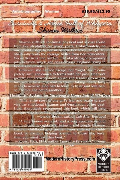 Sharon suffered continual physical and sexual abuse from her stepfather for seven years. Unfortunately, no one would listen to her or believe her story. At age 16, she finally finds the courage to flee from her tormenters. Social Services find her the first of a string of temporary jobs between which she criss-crosses England trying to find a safe haven. However, she cannot escape her "night devil" completely until she comes to terms with her past. Sharon's growth and recovery from abuse and learning to accept love would be a long road to travel, taking nearly forty years to achieve. She had to learn to trust and love herself before she could another. Faced with society's judgments against her, Sharon stood alone against the people who abused her for seven years. The truth is, we don't start to heal when taken from an abusive situation; we only start to digest and relive its emotional content. Many go on to live their lives with tortured souls and an inability to trust and love their own children. Equally, many of us find the inner child that God intended; we pull that child past the empty adult left by years of mutilation of our childhood souls. I was a no-hoper, unjustly cast out into a world of desolation and loneliness that pulled at my heart like a lead weight. I self-harmed and mutilated parts of my mind and body to try and erase memories. Eventually, I learned that healing was within me and could never be found under that largest or smallest boulder. I have walked the road of hope and desire and looked into the pool of my future. I did not want to be the mother they had raised, or the wife they had created. Slowly, I started to rebuild my life and my wish is that this book offers the same hope to you. Therapists' Acclaim for Surviving a House Full of Whispers "This is the story of one girl's fear and battle to survive the emotional traumas and deprivation of her past. I can thoroughly recommend this book which will help anyone who is, or has, suffered abuse." --Lynda Bevan, author Life After Betrayal "A very honest account, and a very accurate view of the feelings, thoughts and behaviors of people traumatized in childhood and youth. If you suffered in childhood, or are in a helping position to those who have, then you must read this book." --Robert Rich, PhD, author Cancer: A Personal Challenge The Reflections of History Series from Modern History Press ModernHistoryPress.com Autobiography: Women