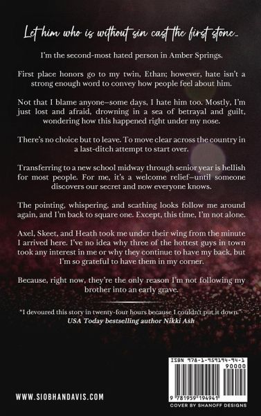 Let him who is without sin cast the first stone... I'm the second-most hated person in Amber Springs. First place honors go to my twin, Ethan; however, hate isn't a strong enough word to convey how people feel about him. Not that I blame anyone-some days, I hate him too. Mostly, I'm just lost and afraid, drowning in a sea of betrayal and guilt, wondering how this happened right under my nose. There's no choice but to leave. To move clear across the country in a last-ditch attempt to start over. Transferring to a new school midway through senior year is hellish for most people. For me, it's a welcome relief-until someone discovers our secret and now everyone knows. The pointing, whispering, and scathing looks follow me around again, and I'm back to square one. Except, this time, I'm not alone. Asher, Skeet, and Heath took me under their wing from the minute I arrived here. I've no idea why three of the hottest guys in town took any interest in me or why they continue to have my back, but I'm so grateful to have them in my corner. Because, right now, they're the only reason I'm not following my brother into an early grave. This is an upper YA/NA reverse harem STANDALONE contemporary romance. Due to sensitive content, and possible triggers, this book is recommended to readers aged 18+. Full length novel.