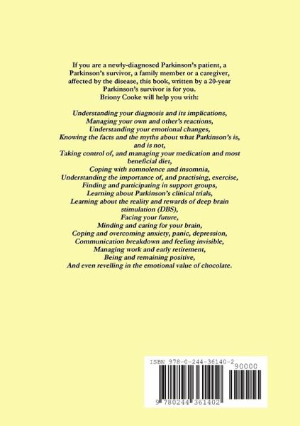 If you are a newly-diagnosed Parkinson's patient, a Parkinson's survivor, a family member or a caregiver, affected by the disease, this book, written by a 20-year Parkinson's survivor is for you. Briony Cooke will help you with: Understanding your diagnosis and its implications, Managing your own and other's reactions, Understanding your emotional changes, Knowing the facts and the myths about what Parkinson's is, and is not, Taking control of, and managing your medication and most beneficial diet, Coping with somnolence and insomnia, Understanding the importance of, and practising, exercise, Finding and participating in support groups, Learning about Parkinson's clinical trials, Learning about the reality and rewards of deep brain stimulation (DBS), Facing your future, Minding and caring for your brain, Coping and overcoming anxiety, panic, depression, Communication breakdown and feeling invisible, Managing work and early retirement, Being and remaining positive.