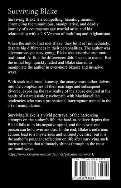 Surviving Blake is a compelling, haunting memoir chronicling the tumultuous, manipulative, and deadly journey of a courageous gay martial artist and his relationship with a US Veteran of both Iraq and Afghanistan. When the author first met Blake, they hit it off immediately, despite big differences in their personalities. The author was adventurous yet easy-going; Blake was assertive and more traditional. At first the differences didn't seem to matter. But the initial high quickly faded and Blake started to manipulate the author in ever-more bizarre and invasive ways. With stark and brutal honesty, the anonymous author delves into the complexities of their marriage and subsequent divorce, exposing the raw reality of the abuse endured at the hands of a narcissistic psychopath with Machiavellian tendencies who was a professional interrogator trained in the art of manipulation. Surviving Blake is a vivid portrayal of the harrowing attempts on the author's life, the hard-to-believe depths that Blake falls to in his negative spiral, and the power one person can hold over another. In the end, Blake's nefarious actions lead to a mysterious and untimely demise, but it is the author's poignant reflection on life after surviving such intense trauma that ultimately shines through in the most profound ways.