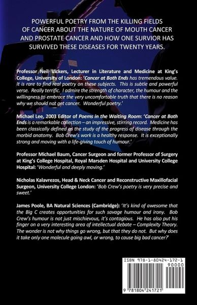 Powerful poetry from the killing fields of cancer about the nature of mouth cancer and prostate cancer and how one survivor has survived these diseases for eleven years. Neil Vickers, Lecturer in Literature and Medicine at King's College, University of London: 'Cancer at Both Ends has tremendous value. It is rare to find real poetry on these subjects. This is subtle and powerful verse. Really terrific. I admire the strength of character, the humour and the willingness to embrace the very uncomfortable truth that there is no reason why we should not get cancer. Wonderful poetry.' Michael Lee, 2003 Editor of Poems in the Waiting Room: 'Cancer at Both Ends is a remarkable collection - an impressive, stirring record. Medicine has been classically defined as the study of the progress of disease through the morbid anatomy. Bob Crew's work is a healthy response. It is exceptionally strong and moving with a life-giving touch of humour. Professor Michael Baum, Cancer Surgeon and former Professor of Surgery at Kings College Hospital, Royal Marsden Hospital and University College Hospital. 'Wonderful and deeply moving.' Nicholas Kalavrezos, Head & Neck Cancer and Reconstructive Maxillofacial Surgeon, University College London: 'Bob Crew's poetry is very precise and sweet.' James Poole, BA Natural Sciences (Cambridge): 'It's kind of awesome that the Big C creates opportunities for such savage humour and irony. Bob Crew's humour is not just mischievous, it's contagious. He has also put his finger on a very interesting area of intellectual debate - Complexity Theory. The wonder is not why things go wrong, but that they do not. But why does it take only one molecule going awl, or wrong, to cause big bad cancer?'