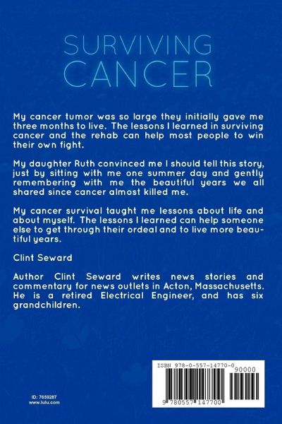 My cancer tumor was so large they gave me three months to live. The lessons I learned in surviving cancer, the operation, and rehab can help most people to win their own fight. I have included them in this story. My daughter Ruth convinced me I should tell this story, just by sitting with me one summer day and gently remembering with me the beautiful three years we all shared since cancer almost killed me. My cancer survival taught me lessons about life and about myself. The lessons I learned can help someone else get through their own ordeal. Clint Seward Author Clint Seward: his family urged him to write this story of the lessons he learned while surviving cancer and overcoming paralysis, to help others survive their cancer.