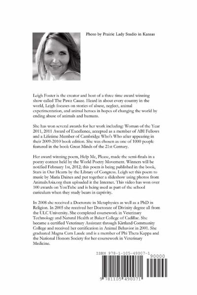Learn tips and important information that will help save your life as well as the lives of your children and pets. This is a must have book to have on hand in order to prepare your home and family for emergencies. Being prepared is your only chance to survive even the worst case scenario. Don't delay, prepare today. Leigh Foster is the creator and host of a three time award winning show called The Pawz Cauze. Heard in about every country in the world, Leigh focuses on stories of abuse, neglect, animal experimentation, and animal heroes in hopes of changing the world by ending abuse of animals and humans. She has won several awards for her work including: Woman of the Year 2011, 2011 Award of Excellence, accepted as a member of ABI Fellows and a Lifetime Member of Cambridge Who's Who after appearing in their 2009-2010 book edition. She was chosen as one of 1000 people featured in the book Great Minds of the 21st Century.