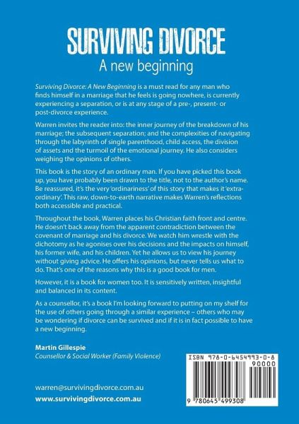 A book which assists in the emotional, physical and spiritual recovery from Divorce. A book dealing with divorce; divorce recovery; marriage and divorce; self-help; children and divorce; God and divorce; Christianity and divorce; mental health; and divorce and suicide. 120 pages A5 size.