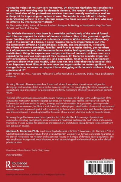 Surviving Domestic Abuse examines how formal and informal supports and services can mitigate the damaging, and sometimes fatal, social cost of domestic violence. The book highlights victims' perceptions of supports and lays a foundation for professionals and family members to effectively assist victims of domestic abuse. The book offers actionable recommendations and multiple-use cases to fill gaps in the understanding of the complexities that exist in domestic violence dynamics. Dr Finneran uses real-life interviews with victims to inform action and intervention for policy, strategy and decision-making for support and service providers including law enforcement, healthcare, social services and employers. Identification of successful supports and services can assist in preventing victims from returning to their abusive relationships, and the author provides real-life examples and a sounding board for the voices of real women who have endured domestic abuse. Spanning the gulf between research and practice, this is the ideal book for a range of professional communities including psychologists, social workers and healthcare professionals, and victims and survivors themselves. It's also suitable for academics and researchers, and students taking domestic violence treatment and prevention courses.