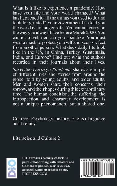 What is it like to experience a pandemic? How have your life and your world changed? What has happened to all the things you used to do and took for granted? Your government has told you the world is no longer safe. You cannot carry on the way you always have before March 2020. You cannot travel, nor can you socialize. You must wear a mask to protect yourself and keep six feet from another person. What does daily life look like in the US, in China, Turkey, Guatemala, India, and Europe? Find out what the authors recordedin their journals about their lives. This book shares a glimpse of different lives and stories from around the globe, told by young adults, and older adults. Men and women share their concerns, their sorrow, and their hopes during this extraordinary time. The human condition, the suffering, the introspection and character development is not a unique phenomenon, but a shared one. Courses: Psychology, history, English language and literacy General Public interest