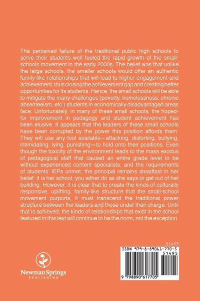 The perceived failure of the traditional public high schools to serve their students well fueled the rapid growth of the small-schools movement in the early 2000s. The belief was that unlike the large schools, the smaller schools would offer an authentic family-like relationships that will lead to higher engagement and achievement, thus closing the achievement gap and creating better opportunities for its students. Hence, the small schools will be able to mitigate the many challenges (poverty, homelessness, chronic absenteeism, etc.) students in economically disadvantaged areas face. Unfortunately, in many of these small schools, the hoped-for improvement in pedagogy and student achievement has been elusive. It appears that the leaders of these small schools have been corrupted by the power this position affords them. They will use any tool available--attacking, distorting, bullying, intimidating, lying, punishing--to hold onto their positions. Even though the toxicity of the environment leads to the mass exodus of pedagogical staff that caused an entire grade level to be without experienced content specialists, and the requirements of students' IEPs unmet, the principal remains steadfast in her belief: it is her school; you either do as she says or get out of her building. However, it is clear that to create the kinds of culturally responsive, uplifting, family-like structure that the small-school movement purports, it must transcend the traditional power structure between the leaders and those under their charge. Until that is achieved, the kinds of relationships that exist in the school featured in this text will continue to be the norm, not the exception.