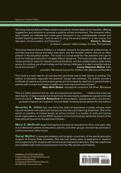 Introduction Managing School Politics and Maintaining Personal IntegrityIt's Those Little Things That Build Up in SchoolsSurviving the Teachers LoungeDealing with Faculty MeetingsCoping with Professional JealousyAvoiding Stagnation: Dealing with the Pressure to Stay With the Group and Not Excel Working Effectively and Professionally with the Building AdministratorMaintaining Professional Behavior with ParentsCommunicating in a Political MinefieldDealing with the Dynamics Created by Emotionally Unhealthy Staff MembersAdvocacy for Children versus Job SecurityWays to Open Avenues to AcceptanceDealing with Ostracism: Yours and Your ColleaguesThe Politics of TechnologyTeaching in a Time of TurmoiMaking That Final Decision: Can I Stay, or Do I Need to Move On? Conclusion