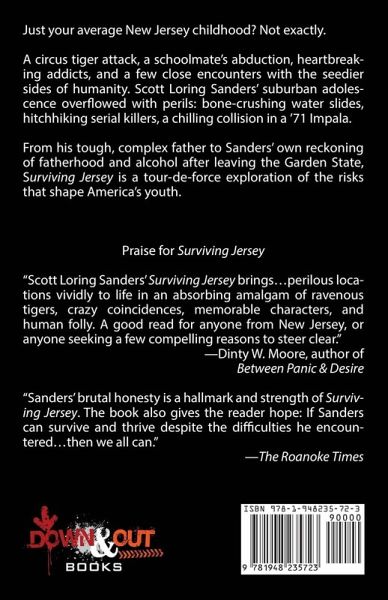 Finalist for Best Book of 2017 by CLMP’s Firecracker Award Just your average New Jersey childhood? Not exactly. A circus tiger attack, a schoolmate’s abduction, heartbreaking addicts, and a few close encounters with the seedier sides of humanity. Scott Loring Sanders’ suburban adolescence overflowed with perils: bone-crushing water slides, hitchhiking serial killers, a chilling collision in a ’71 Impala. From his tough, complex father to Sanders’ own reckoning of fatherhood and alcohol after leaving the Garden State, Surviving Jersey is a tour-de-force exploration of the risks that shape America’s youth. Praise for SURVIVING JERSEY: "Scott Loring Sanders’ Surviving Jersey brings…perilous locations vividly to life in an absorbing amalgam of ravenous tigers, crazy coincidences, memorable characters, and human folly. A good read for anyone from New Jersey, or anyone seeking a few compelling reasons to steer clear." —Dinty W. Moore, author of Between Panic & Desire "Exuberant, gritty, and laugh-out-loud funny." —Matthew Vollmer, author of Permanent Exhibit "We realize by the time we close this wonderful book that we have been reading not only about fear and human mistakes and how to survive despite them…but also about the richness of life, its connections and joys —the very things that help us hold onto hope for the future." —Arts Fuse "Sanders’ brutal honesty is a hallmark and strength of Surviving Jersey. The book also gives the reader hope: If Sanders can survive and thrive despite the difficulties he encountered…then we all can." —The Roanoke Times "Surviving Jersey takes one of the most fundamental human endeavors, to survive the hazards of our world, and applies it to hardy characters, risky decisions, and life-altering events. Its magic goes beyond asking Where are we going? and reminds us to also wonder: How did we make it to here? " —Sweet: A Literary Confection