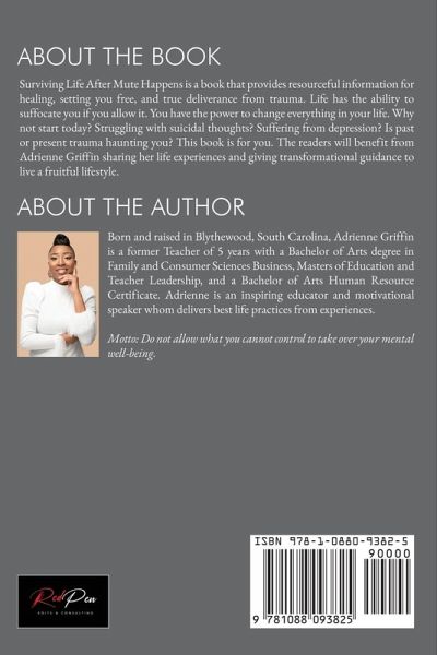 Surviving Life After Mute Happens is a book that provides resourceful information for healing, setting you free, and true deliverance from trauma. Life has the ability to suffocate you if you allow it. You have the power to change everything in your life. Why not start today. Struggling with suicidal thoughts? Suffering from depression? Is past or present trauma haunting you? This book is for you. The readers will benefit from Adrienne Griffin sharing her life experiences and giving transformational guidance to live a fruitful lifestyle. Born and raised in Blythewood, South Carolina, Adrienne Griffin is a former Teacher of 5 years with a Bachelor of Arts degree in Family and Consumer Sciences Business, Masters of Education and Teacher Leadership, and a Bachelor of Arts Human Resource Certificate. Adrienne has created a platform on social media called D.E.T.O.X. Rocks designed for personal growth. This platform is a holistic approach that has been established for taking a lens to view what is on the inside of you mentally and spiritually and transforming your life to fulfill your purpose. D.E.T.O.X. Rocks, LLC is a holistic approach to a transformational cleanse assisting with personal growth, freedom and wholeness. We normalize mental health by teaching individuals how "not" to suffer in silence. This platform provides several resources for teens and adults.