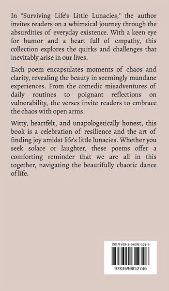 In "Surviving Life's Little Lunacies," the author invites readers on a whimsical journey through the absurdities of everyday existence. With a keen eye for humor and a heart full of empathy, this collection explores the quirks and challenges that inevitably arise in our lives. Each poem encapsulates moments of chaos and clarity, revealing the beauty in seemingly mundane experiences. From the comedic misadventures of daily routines to poignant reflections on vulnerability, the verses invite readers to embrace the chaos with open arms. Witty, heartfelt, and unapologetically honest, this book is a celebration of resilience and the art of finding joy amidst life's little lunacies. Whether you seek solace or laughter, these poems offer a comforting reminder that we are all in this together, navigating the beautifully chaotic dance of life.