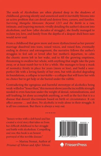 The seeds of alcoholism are often planted deep in the shadows of childhood, growing silently and unnoticed until it inevitably blooms into an active problem that can derail and destroy lives, careers, and families. Surviving Magnelia Monsoon: Beyond 1215 and the Bottle is a raw, intimate, and inspiring memoir, vividly detailing the author's descent into alcoholism, and how (after decades of struggle), she finally managed to reclaim joy, love, and family from the depths of a despair she'd been sure would never end. From a childhood that grew more and more dysfunctional as her parents' marriage dissolved into tears, raised voices, and raised fists, eventually ending in divorce and estrangement, the narrative follows the author's struggles to feel safe or loved after her mother's departure, to calm the chaotic storm left in her wake, and to fill the growing emptiness, threatening to swallow her whole, with anything that might take the pain away, or at least numb her to it for a while. She manages to keep a mask of normalcy firmly in place for years (more or less), and build a near-perfect life with a loving family of her own, but with alcohol degrading its foundations, a collapse is inevitable-a collapse that will leave her with no choice but to get help or die buried under the rubble. Contradicting the egregious and harmful stereotype of alcoholics being weak-willed or "lesser than," this memoir showcases the incredible strength needed to even function under the weight of denial, rationalizations, and self-loathing, let alone accomplish anything, as well as the fact that it is a disease that doesn't discriminate based on birth or circumstance. It can affect anyone ... and does. No alcoholic is truly alone in their struggle. It is all too common. But there is always a way out.