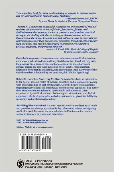 Based on years of studying and working with medical students Surviving Medical School offers an orientation to the hectic, anxious area of medical education and practical advice for thriving in that environment. Topics covered include: students' expectations in relation to intellectual and emotional capacities; career doubt and alienation; clinical experience; physician fallibility, internships; and professional practice.