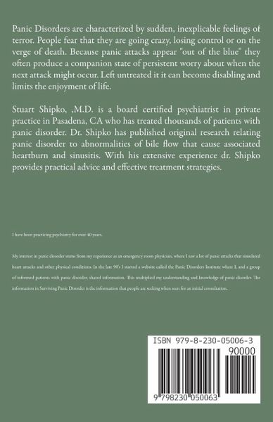Panic Disorders are characterized by sudden, inexplicable feelings of terror. People fear that they are going crazy, losing control or on the verge of death. Because panic attacks appear "out of the blue" they often produce a companion state of persistent worry about when the next attack might occur. Left untreated it it can become disabling and limits the enjoyment of life. Stuart Shipko, ,M.D. is a board certified psychiatrist in private practice in Pasadena, CA who has treated thousands of patients with panic disorder. Dr. Shipko has published original research relating panic disorder to abnormalities of bile flow that cause associated heartburn and sinusitis. With his extensive experience dr. Shipko provides practical advice and effective treatment strategies.