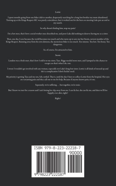 Lottie I spent months going from one biker club to another, desperately searching for a long-lost brother my mum abandoned. Turning up at the Kings Reapers MC was purely coincidence, but it worked out for the best cos meeting Lake put an end to my search. So why doesn't finding him, stop my pain? I'm a hot mess, that's how a social worker once described me, and poor Lake did nothing to deserve having me as a sister. Then, one day, I cave because the world becomes too much and who turns up to save me but Storm, newest member of the Kings Reapers. Running away from his own demons, the mysterious biker is too much. Too intense. Too hot. Too bossy. Too dangerous. So, of course, I'm attracted to him. Storm London was a fresh start, that's how I sold it to my sister, Taya. Riggs needed more men, and I jumped at the chance to escape cos that's what I do, run. I swore I wouldn't get involved with any woman, especially not Lake's long-lost sister. Lottie is all kinds of messed up and she's a complication I don't fuckin' need. My priority is getting Taya and my son, Seb, settled. That is, until the day I have to collect Lottie from the hospital. Her eyes are screaming pain and they call out to me for help. Because if anyone knows pain, it's me. Separately, we're suffering . . . but together, we're toxic. But I know we met for a reason and I ain't letting her slip away from me. I can fix her, she can fix me, and then we'll live happily ever after, right? Right?