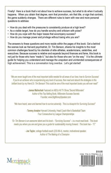 Finally! Here is a book that's not about how to achieve success, but what to do when it actually happens. When you obtain that degree, earn that promotion, win that title, or sign that contract, the game suddenly changes. There are different rules to learn with new and more personal questions to address: ¿ How do you deal with the pressures to consistently produce at a high level? ¿ As a visible target, how do you handle scrutiny and criticism with poise? ¿ How do you cope with the major losses that accompany success? ¿ How do you manage power and privilege without losing who you are? The answers to these questions and more reside within the pages of this book. Get a behind the scenes look as Harvard psychiatrist, Dr. Tim Benson, shares his insights to the most common challenges faced by his clientele of elite athletes, academicians, celebrities, and executives. Because success is relative and expands beyond finances and fame, this book is not just for those who have "made it," but also for those who are "on the way." It is the ultimate guide for helping you understand and manage the unspoken and unintended consequences of high achievement. This is a conversation long overdue. Let's get started!
