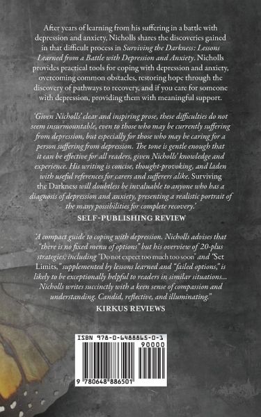 Surviving the Darkness: Lessons learned from experience After years of learning from his suffering, Nicholls outlines some practical tools for coping with depression and anxiety, overcoming common obstacles, restoring hope through the discovery of pathways to recovery, and if you care for someone with depression, providing them with meaningful support. Who should read Surviving the Darkness Surviving the Darkness will doubtless be invaluable to anyone who has a diagnosis of depression and anxiety, presenting a realistic portrait of the many pathways to recovery. For caregivers and supporters of those with depression, Nicholls offers helpful suggestions including comprehensive tables detailing things to say (and to avoid saying), warning signs to look out for, prevention tips and the importance of self-care. What you will get from reading this book A concise, thought-provoking account about recovery from depression and anxiety. Useful references and practical tools for sufferers and carers. Guidance on ways to overcome common obstacles (the barriers to treatment). How to become "the driver, not a passenger" in your recovery. An understanding of the treatment options including tips on selecting your Recovery Team and how to identify 'good' therapy. Coping strategies that you can use or adapt to your situation. Benefits of the lessons learned over many years from a battle with depression and anxiety. An abundance of encouragement and ultimately, the means of restoring hope. Once you have these practical tools at your disposal, Surviving the Darkness becomes the only option.
