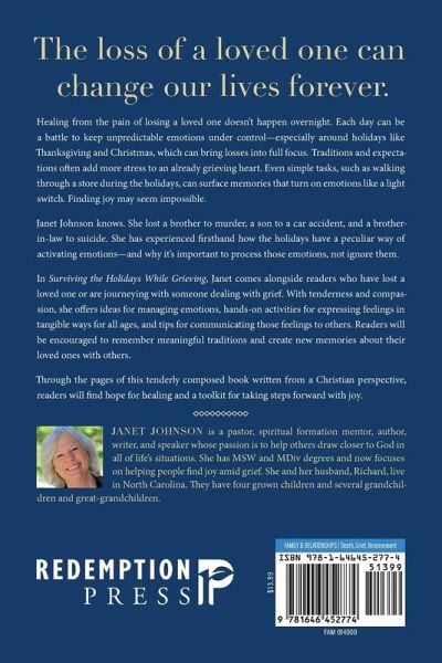 The loss of a loved one can change our lives forever. Healing from the pain of losing a loved one doesn't happen overnight. Each day can be a battle to keep unpredictable emotions under control-especially around holidays like Thanksgiving and Christmas, which can bring losses into full focus. Traditions and expectations often add more stress to an already grieving heart. Even simple tasks, such as walking through a store during the holidays, can surface memories that turn on emotions like a light switch. Finding joy may seem impossible. Janet Johnson knows. She lost a brother to murder, a son to a car accident, and a brother-in-law to suicide. She has experienced firsthand how the holidays have a peculiar way of activating emotions-and why it's important to process those emotions, not ignore them. In Surviving the Holidays While Grieving, Janet comes alongside readers who have lost a loved one or are journeying with someone dealing with grief. With tenderness and compassion, she offers ideas for managing emotions, hands-on activities for expressing feelings in tangible ways, and tips for communicating those feelings to others. Readers will be encouraged to remember meaningful traditions and create new memories about their loved ones with others. Through the pages of this tenderly composed book written from a Christian perspective, readers will find hope for healing and a toolkit for taking steps forward with joy.