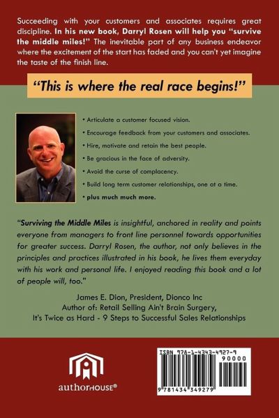 Succeeding with your customers and associates requires great discipline. In his new book, Darryl Rosen will help you "survive the middle miles!" The inevitable part of any business endeavor where the excitement of the start has faded and you can't yet imagine the taste of the finish line. "This is where the real race begins!" Articulate a customer focused vision. Encourage feedback from your customers and associates. Hire, motivate and retrain the best people. Be gracious in the face of adversity. Avoid the curse of complacency. Build long term customer relationships, one at a time. plus much much more.