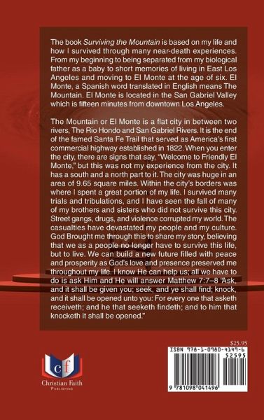 The book Surviving the Mountain is based on my life and how I survived through many near-death experiences. From my beginning to being separated from my biological father as a baby to short memories of living in East Los Angeles and moving to El Monte at the age of six. El Monte, a Spanish word translated in English means The Mountain. El Monte is located in the San Gabriel Valley which is fifteen minutes from downtown Los Angeles. The Mountain or El Monte is a flat city in between two rivers, The Rio Hondo and San Gabriel Rivers. It is the end of the famed Santa Fe Trail that served as America's first commercial highway established in 1822. When you enter the city, there are signs that say, "Welcome to Friendly El Monte," but this was not my experience from the city. It has a south and a north part to it. The city was huge in an area of 9.65 square miles. Within the city's borders was where I spent a great portion of my life. I survived many trials and tribulations, and I have seen the fall of many of my brothers and sisters who did not survive this city. Street gangs, drugs, and violence corrupted my world. The casualties have devastated my people and my culture. God Brought me through this to share my story, believing that we as a people no longer have to surviving this life, but to live. We can build a new future filled with peace and prosperity as God's love and presence preserved me throughout my life. I know He can help us; all we have to do is ask Him and He will answer Matthew 7:7-8 "Ask, and it shall be given you; seek, and ye shall find; knock, and it shall be opened unto you: For every one that asketh receiveth; and he that seeketh findeth; and to him that knocketh it shall be opened."