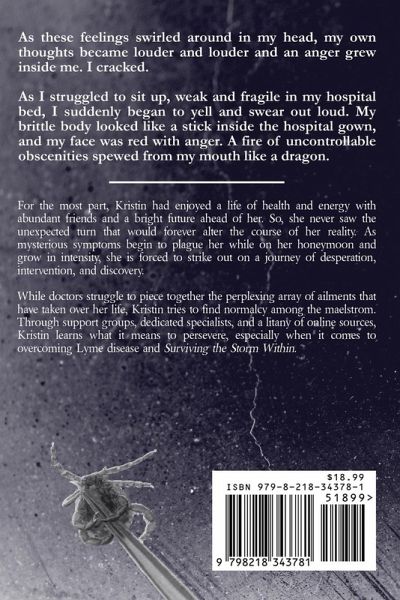As these feelings swirled around in my head, my own thoughts became louder and louder and an anger grew inside me. I cracked. As I struggled to sit up, weak and fragile in my hospital bed, I suddenly began to yell and swear out loud. My brittle body looked like a stick inside the hospital gown, and my face was red with anger. A fire of uncontrollable obscenities spewed from my mouth like a dragon. *** For the most part, Kristin had enjoyed a life of health and energy with abundant friends and a bright future ahead of her. So, she never saw the unexpected turn that would forever alter the course of her reality. As mysterious symptoms begin to plague her while on her honeymoon and grow in intensity, she is forced to strike out on a journey of desperation, intervention, and discovery. While doctors struggle to piece together the perplexing array of ailments that have taken over her life, Kristin tries to find normalcy among the maelstrom. Through support groups, dedicated specialists, and a litany of online sources, Kristin learns what it means to persevere, especially when it comes to overcoming Lyme disease and Surviving the Storm Within.