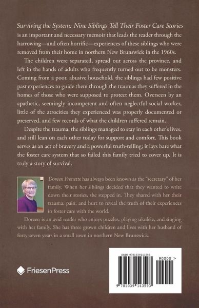 Surviving the System: Nine Siblings Tell Their Foster Care Stories is an important and necessary memoir that leads the reader through the harrowing-and often horrific-experiences of these siblings who were removed from their home in northern New Brunswick in the 1960s. The children were separated, spread out across the province, and left in the hands of adults who frequently turned out to be monsters. Coming from a poor, abusive household, the siblings had few positive past experiences to guide them through the traumas they suffered in the homes of those who were supposed to protect them. Overseen by an incompetent and often neglectful social worker, little of the atrocities they experienced was properly documented or preserved, and few records of what the children suffered remain. Despite the trauma, the siblings managed to stay in each other's lives, and still lean on each other today for support and comfort. This book serves as an act of bravery and a powerful truth-telling; it lays bare what the foster care system that so failed this family tried to cover up. It is truly a story of survival.