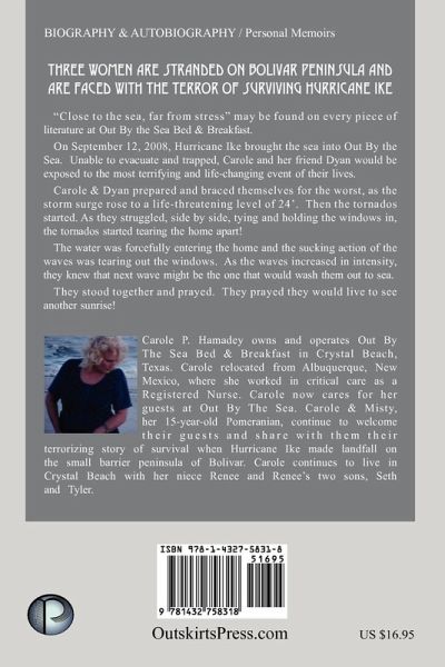 "Far from stress, close to the sea", may be found on every piece of literature at Out By The Sea Bed & Breakfast. On September 12, 2008, Hurricane Ike brought the sea into Out By The Sea. Unable to evacuate, Carole & her friend Dyan would be exposed to the most terrifying and life changing experience of their lives. Carole & Dyan prepared and braced themselves for the worst, as the storm surge rose to a life-threatening level of 24', and the winds began to gust to 140mph. Then the tornados started. As Carole was trying to prevent the water from rushing in on the beach side, Dyan screamed from the Regatta Room on the non-beach side. The window was being ripped away from the frame and the water was gushing in. Dyan & Carole held the top of the window in with their bare hands, and made hooks out of coat hangers to slide under the bottom of the windows. They then tied the hooks to extension cords and tied the cords to the feet of the beds, pulling the cord tight to provide tension on the line. Dyan & Carole held this window in for 3 hours with their bloodied and swollen hands. They prayed for the waves to stop, as the waves tore the house apart. The water was forcefully rushing in with each new wave and drenching them while hitting the ceiling with force. As each stronger and more ferocious wave came around the home, it sounded like a freight train approaching. They held onto the tops of the window locks as water continued to enter the home at an alarming rate. As the waves receded, the sucking effect was pulling the windows away from the home. The window was now 9" away from the wood of the home, the siding and insulation had been torn off and the frames were now non-existent. The waves continued to increase in intensity and they knew that next wave may be the one to wash them out to sea. They stood together and prayed continuously... They prayed that they would live to see another sunrise!