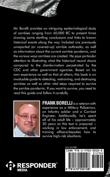 Mr. Borelli provides an intriguing epidemiological study of zombies ranging from 60,000 BC to present times drawing some startling conclusions and links to known historical events along the way. Included are previously unreported (or covered-up) zombie outbreaks, as well as information about the current zombie pandemic, and the various ways zombies are created. He pays particular attention to illustrating what the historical record shows compared to the disinformation perpetrated by the CDC and other government agencies. Based on his own experience as well as that of others, this book is an invaluable guide to detecting, restraining, and destroying zombies as well as other vital steps required to survive the zombie pandemic. If you want to survive, you need to read this guide and follow it carefully.