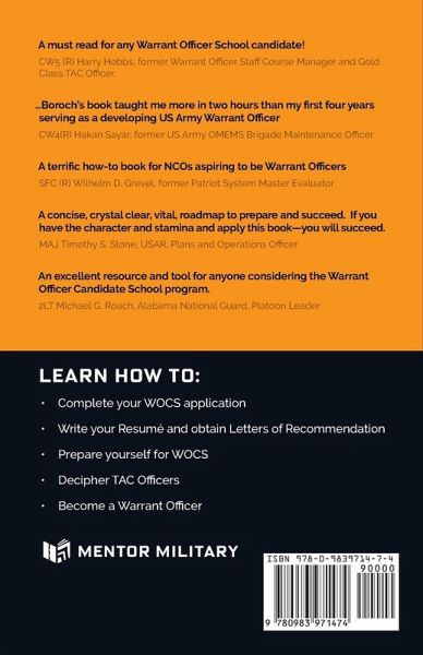 If you're an NCO, and are looking for something more in your career, you may consider Warrant Officer Candidate School (WOCS). It's more than likely you have some questions pertaining to WOCS, and what it means to be a Warrant Officer. Surviving WOCS takes you step-by-step down the path to becoming a Warrant Officer. This read is full of valuable information to help you with everything from the application, all the way through to your graduation. If you're searching for something more fulfilling, higher paying, and with more promotion potential, Surviving WOCS will get you there. Learn How To: Complete your WOCS application Write your Resumé and obtain Letters of Recommendation Prepare yourself for WOCS Deal with TAC Officers Become a Warrant Officer Testimonials "A must read for any Warrant Officer School candidate!" -CW5 (R) Harry Hobbs, former Warrant Officer Staff Course Manager and Gold Class TAC Officer. "Boroch's book taught me more in two hours than my first four years serving as a developing US Army Warrant Officer" -CW4(R) Hakan Sayar, former US Army OMEMS Brigade Maintenance Officer "A terrific how-to book for NCOs aspiring to be Warrant Officers" -SFC (R) Wilhelm D. Grevel, former Patriot System Master Evaluator