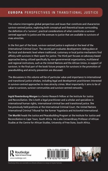 This volume interrogates global perspectives and issues that constitute and characterize survivor-centred justice, exploring both conceptual and theoretical issues surrounding the definition of a 'survivor', practical considerations of what constitutes a survivor-centred approach to justice.