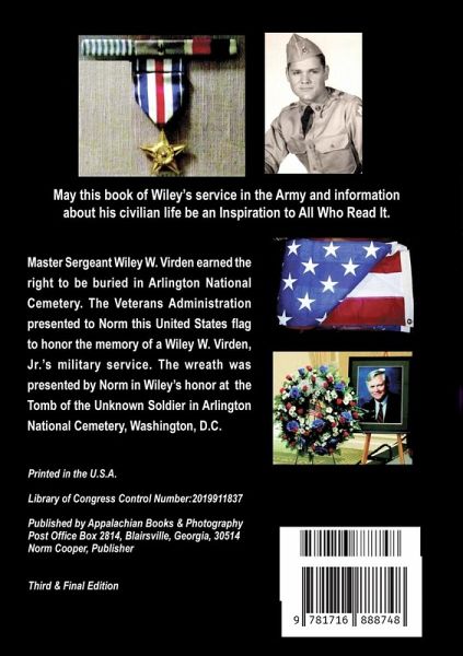 Wiley Walter Virden, Jr., earned a Silver Star and four other medals when serving in combat in the Korean War. He earned the right to be buried in Arlington National Cemetery near Washington, D.C. Wiley chose to be buried in the Virden family cemetery in Digby, Georgia, near the town of Griffin where he was raised in Georgia. An official military headstone for his grave was approved by the United States Government and a nephew, Norm. was given an official United States of America Flag provided in honor of the Army Veteran. To honor the Master Sergeant, a formal wreath laying ceremony was held at Arlington National Cemetery at the Tomb of the Unknown Soldier on August 6, 2019. A wreath was presented by his nephew, Norm, with whom he had a close relationship.