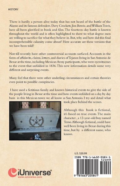 There is hardly a person alive today that has not heard of the battle of the Alamo and its famous defenders. Davy Crockett, Jim Bowie, and William Travis, have all been glorified in book and film. The fourteen-day battle is known throughout the world and is often highlighted to show to what degree men are willing to sacrifice for what they believe in. But, why and how did this final incomprehensible calamity come about? How accurate are these versions that we have been told? Not till recently have other controversial accounts surfaced. Accounts in the form of affidavits, claims, letters, and diaries of Tejanos living in San Antonio de Bexar at the time, including Mexican Army participants, who were eyewitnesses to the event that unfolded in 1836. This new information details some very different and surprising events. Many feel that there were other underling circumstances and certain theories even point to possible conspiracies. I have used a fictitious family and known historical events to give the side of the people living in Bexar at the time and how events unfolded on a day by day basis in this Mexican town we all know as San Antonio. I try and detail what took place behind the scenes. Although this book is fictional it's based on true events. The main character , a 12-year-old boy named Temo. Although fictional, could have very well been have lived in Bexar during this time, but by a different name, who knows.