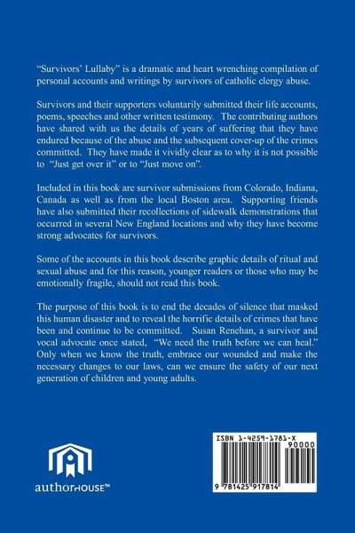 "Survivors' Lullaby" is a dramatic and heart wrenching compilation of personal accounts and writings by survivors of catholic clergy abuse. Survivors and their supporters voluntarily submitted their life accounts, poems, speeches and other written testimony. The contributing authors have shared with us the details of years of suffering that they have endured because of the abuse and the subsequent cover-up of the crimes committed. They have made it vividly clear as to why it is not possible to "Just get over it" or to "Just move on". Included in this book are survivor submissions from Colorado, Indiana, Canada as well as from the local Boston area. Supporting friends have also submitted their recollections of sidewalk demonstrations that occurred in several New England locations and why they have become strong advocates for survivors. Some of the accounts in this book describe graphic details of ritual and sexual abuse and for this reason, younger readers or those who may be emotionally fragile, should not read this book. The purpose of this book is to end the decades of silence that masked this human disaster and to reveal the horrific details of crimes that have been and continue to be committed. Susan Renehan, a survivor and vocal advocate once stated, "We need the truth before we can heal." Only when we know the truth, embrace our wounded and make the necessary changes to our laws, can we ensure the safety of our next generation of children and young adults.