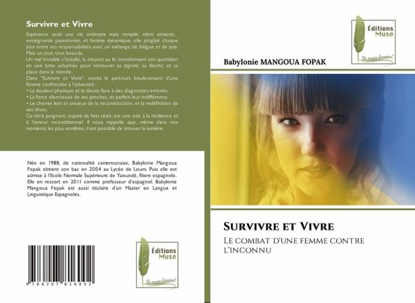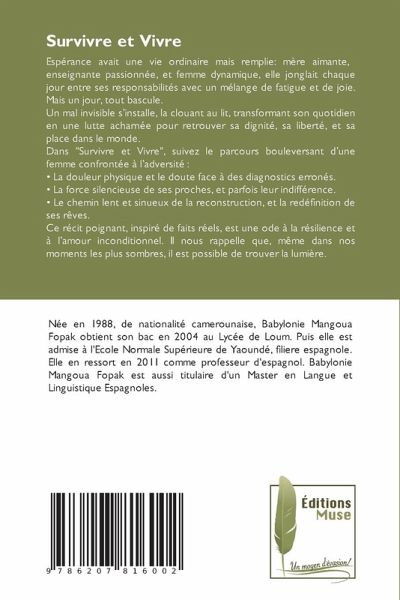 Espérance avait une vie ordinaire mais remplie : mère aimante, enseignante passionnée, et femme dynamique, elle jonglait chaque jour entre ses responsabilités avec un mélange de fatigue et de joie. Mais un jour, tout bascule.Un mal invisible s'installe, la clouant au lit, transformant son quotidien en une lutte acharnée pour retrouver sa dignité, sa liberté, et sa place dans le monde.Dans "Survivre et Vivre", suivez le parcours bouleversant d'une femme confrontée à l'adversité :- La douleur physique et le doute face à des diagnostics erronés.- La force silencieuse de ses proches, et parfois leur indifférence.- Le chemin lent et sinueux de la reconstruction, et la redéfinition de ses rêves.Ce récit poignant, inspiré de faits réels, est une ode à la résilience et à l'amour inconditionnel. Il nous rappelle que, même dans nos moments les plus sombres, il est possible de trouver la lumière.