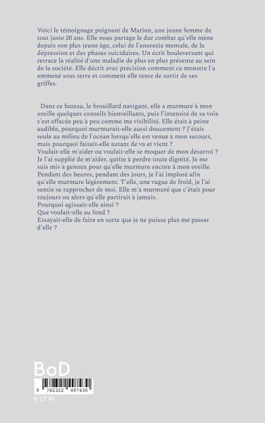 Voici le témoignage poignant de Marion, une jeune femme de tout juste 20 ans. Elle nous partage le dur combat qu'elle mène depuis son plus jeune âge, celui de l'anorexie mentale, de la dépression et des phases suicidaires. Un écrit bouleversant qui retrace la réalité d'une maladie de plus en plus présente au sein de la société. Elle décrit avec précision comment ce monstre l'a emmené sous terre et comment elle tente de sortir de ses griffes. Dans ce bateau, le brouillard navigant, elle a murmuré à mon oreille quelques conseils bienveillants, puis l'intensité de sa voix s'est effacée peu à peu comme ma visibilité. Elle était à peine audible, pourquoi murmurait-elle aussi doucement ? J'étais seule au milieu de l'océan lorsqu'elle est venue à mon secours, mais pourquoi faisait-elle autant de va et vient ? Voulait-elle m'aider ou voulait-elle se moquer de mon désarroi ? Je l'ai supplié de m'aider, quitte à perdre toute dignité. Je me suis mis à genoux pour qu'elle murmure encore à mon oreille. Pendant des heures, pendant des jours, je l'ai imploré afin qu'elle murmure légèrement. T'elle, une vague de froid, je l'ai sentie se rapprocher de moi. Elle m'a murmuré que c'était pour toujours ou alors qu'elle partirait à jamais. Pourquoi agissait-elle ainsi ? Que voulait-elle au fond ? Essayait-elle de faire en sorte que je ne puisse plus me passer d'elle ?