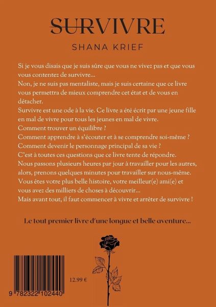 Si je vous disais que je suis sûre que vous ne vivez pas et que vous vous contentez de survivre...Non, je ne suis pas mentaliste, mais je suis certaine que ce livre vous permettra de mieux comprendre cet état et de vous en détacher.Survivre est une ode à la vie. Ce livre a été écrit par une jeune fille en mal de vivre pour tous les jeunes en mal de vivre.Comment trouver un équilibre ? Comment apprendre à s'écouter et à se comprendre soi-même ? Comment devenir le personnage principal de sa vie ? C'est à toutes ces questions que ce livre tente de répondre. Nous passons plusieurs heures par jour à travailler pour les autres, alors, prenons quelques minutes pour travailler sur nous-même. Vous êtes votre plus belle histoire, votre meilleur(e) ami(e) et vous avez des milliers de choses à découvrir... Mais avant tout, il faut commencer à vivre et arrêter de survivre !