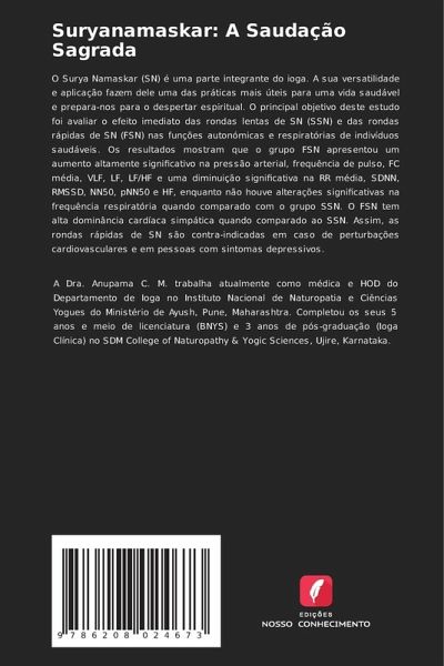 O Surya Namaskar (SN) é uma parte integrante do ioga. A sua versatilidade e aplicação fazem dele uma das práticas mais úteis para uma vida saudável e prepara-nos para o despertar espiritual. O principal objetivo deste estudo foi avaliar o efeito imediato das rondas lentas de SN (SSN) e das rondas rápidas de SN (FSN) nas funções autonómicas e respiratórias de indivíduos saudáveis. Os resultados mostram que o grupo FSN apresentou um aumento altamente significativo na pressão arterial, frequência de pulso, FC média, VLF, LF, LF/HF e uma diminuição significativa na RR média, SDNN, RMSSD, NN50, pNN50 e HF, enquanto não houve alterações significativas na frequência respiratória quando comparado com o grupo SSN. O FSN tem alta dominância cardíaca simpática quando comparado ao SSN. Assim, as rondas rápidas de SN são contra-indicadas em caso de perturbações cardiovasculares e em pessoas com sintomas depressivos.
