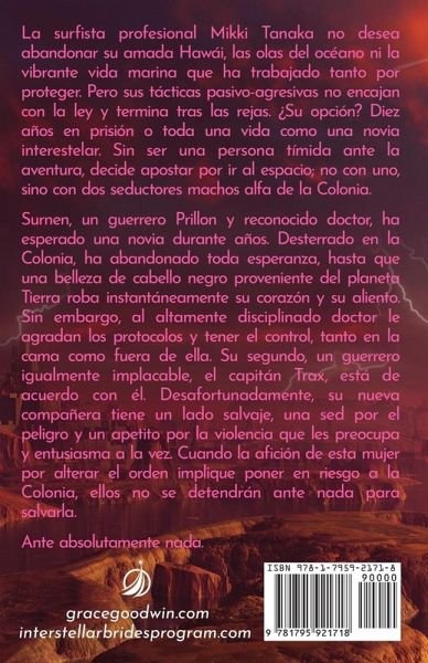 La surfista profesional Mikki Tanaka no desea abandonar su amada Hawái, las olas del océano ni la vibrante vida marina que ha trabajado tanto por proteger. Pero sus tácticas pasivo-agresivas no encajan con la ley y termina tras las rejas. ¿Su opción? Diez años en prisión o toda una vida como una novia interestelar. Sin ser una persona tímida ante la aventura, decide apostar por ir al espacio; no con uno, sino con dos seductores machos alfa de la Colonia. Surnen, un guerrero Prillon y reconocido doctor, ha esperado una novia durante años. Desterrado en la Colonia, ha abandonado toda esperanza, hasta que una belleza de cabello negro proveniente del planeta Tierra roba instantáneamente su corazón y su aliento. Sin embargo, al altamente disciplinado doctor le agradan los protocolos y tener el control, tanto en la cama como fuera de ella. Su segundo, un guerrero igualmente implacable, el capitán Trax, está de acuerdo con él. Desafortunadamente, su nueva compañera tiene un lado salvaje, una sed por el peligro y un apetito por la violencia que les preocupa y entusiasma a la vez. Cuando la afición de esta mujer por alterar el orden implique poner en riesgo a la Colonia, ellos no se detendrán ante nada para salvarla. Ante absolutamente nada.