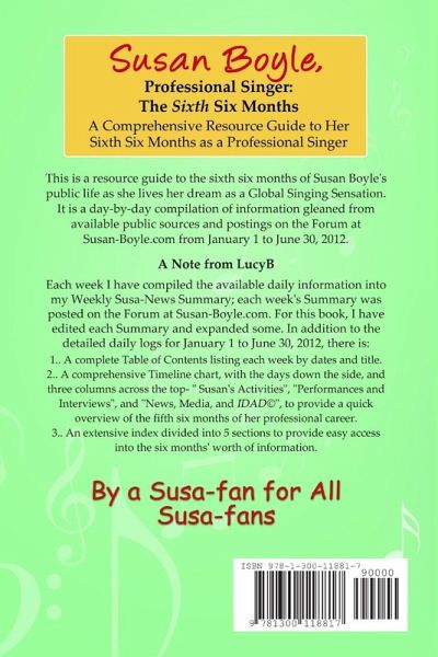 This is a guide to the public life of Susan Boyle from January 1 through June 30, 2012 as she lives her dream as a Global Singing Sensation. Daily details of the initial production of the musical "I Dreamed A Dream" are also included.