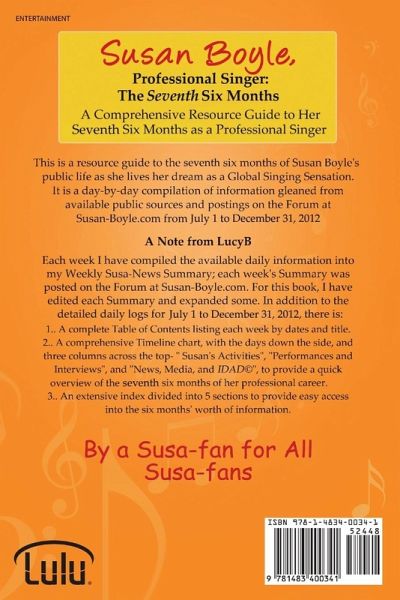 This is the 7th book in an on-going series that chronicles the day-by-day details gleaned from available public information as Susan Boyle pursues her career as a world-renown professional singer and entertainer. Included are numerous tweets; highlights from fan reports, reviews, and media reports; links to YouTube videos; as well as other information that provides the reader a better understanding of Susan's incredible evolving career. This book covers the 7th six months, July 1 through December 31, 2012. Just a brief synopsis of events during this six month period: 1) Sang 2 songs at 15 of the 27 shows of IDAD(c) in Glasgow and Edinburgh; 2) Released album #4, Standing Ovation, with 2 duets with Donny Osmond; 4) Sang "This Is The Moment" with Donny Osmond in Los Angeles at Dancing With The Stars and at the Flamingo Hotel in Las Vegas; 5) In London and New York singing "Somewhere Over The Rainbow" and "This Is The Moment" to promote Standing Ovation.