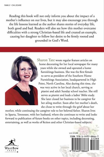 Reading this book will not only inform you about the impact of a mother's influence on our lives, but it may also encourage you through the life lessons learned as the author shares stories of everyday life, both good and bad. Readers will also see how this mother overcame difficulties with a strong Christian-based life and created an example, causing her daughter to follow her desire to be firmly rooted and grounded in God's Word.